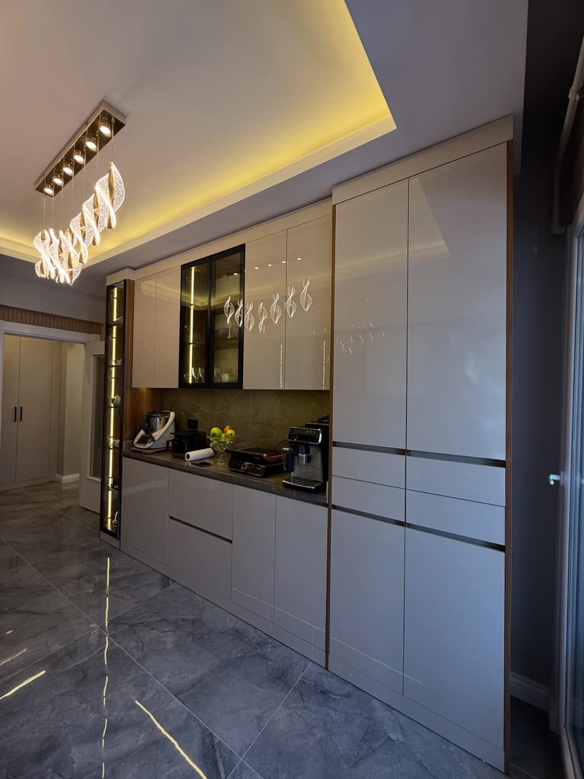 تنفيذ مطابخ عصرية تجمع بين لون اللاتيه الهادئ وهياكل الألمنيوم المتينة، مما يمنح المطبخ مظهرًا أنيقًا مع مقاومة عالية للرطوبة وسهولة في الصيانة والتنظيف.
